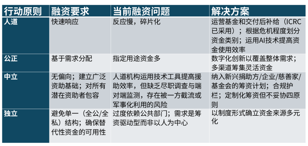 针对这些挑战,本文明确了人道行动四大原则与融资机制之间的关联,并为人道机构提出三点建议。